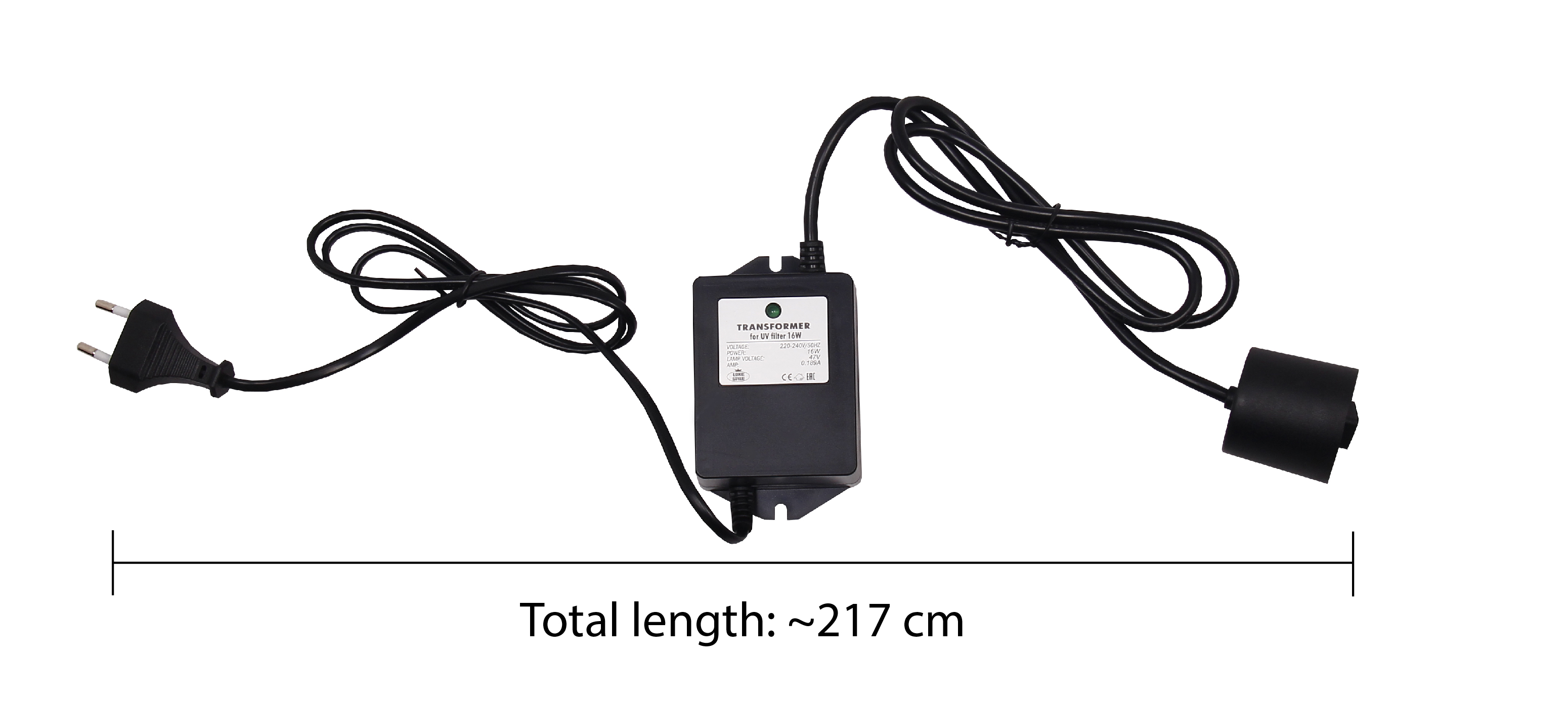 Input – 230 V AC. Output – for 16 W UV lamp. Indoor use only.