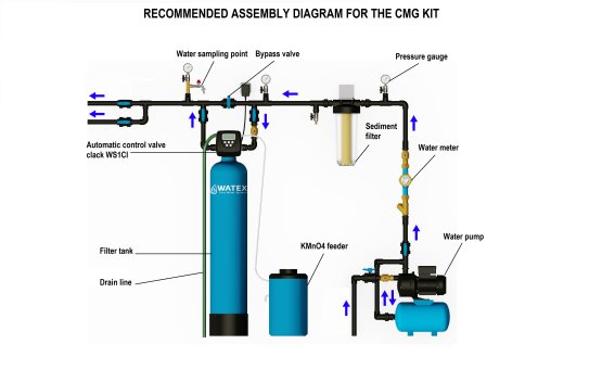 WATEX CMG sērijas iekārtu darbības pamatā ir “Greensand Plus” katalītiskais filtrējošais materiāls. Filtra materiāls spēj oksidēt ūdenī esošo divvērtīgo dzelzi un uzkrāt to filtrā. Lai izvadītu uzkrāto dzelzi, iekārta tiek automātiski reģenerēta (skalota). Reģenerācijas laikā tiek izmantots KMnO4(zilie graudiņi), kas atjauno filtrējošā materiāla spēju oksidēt dzelzi.