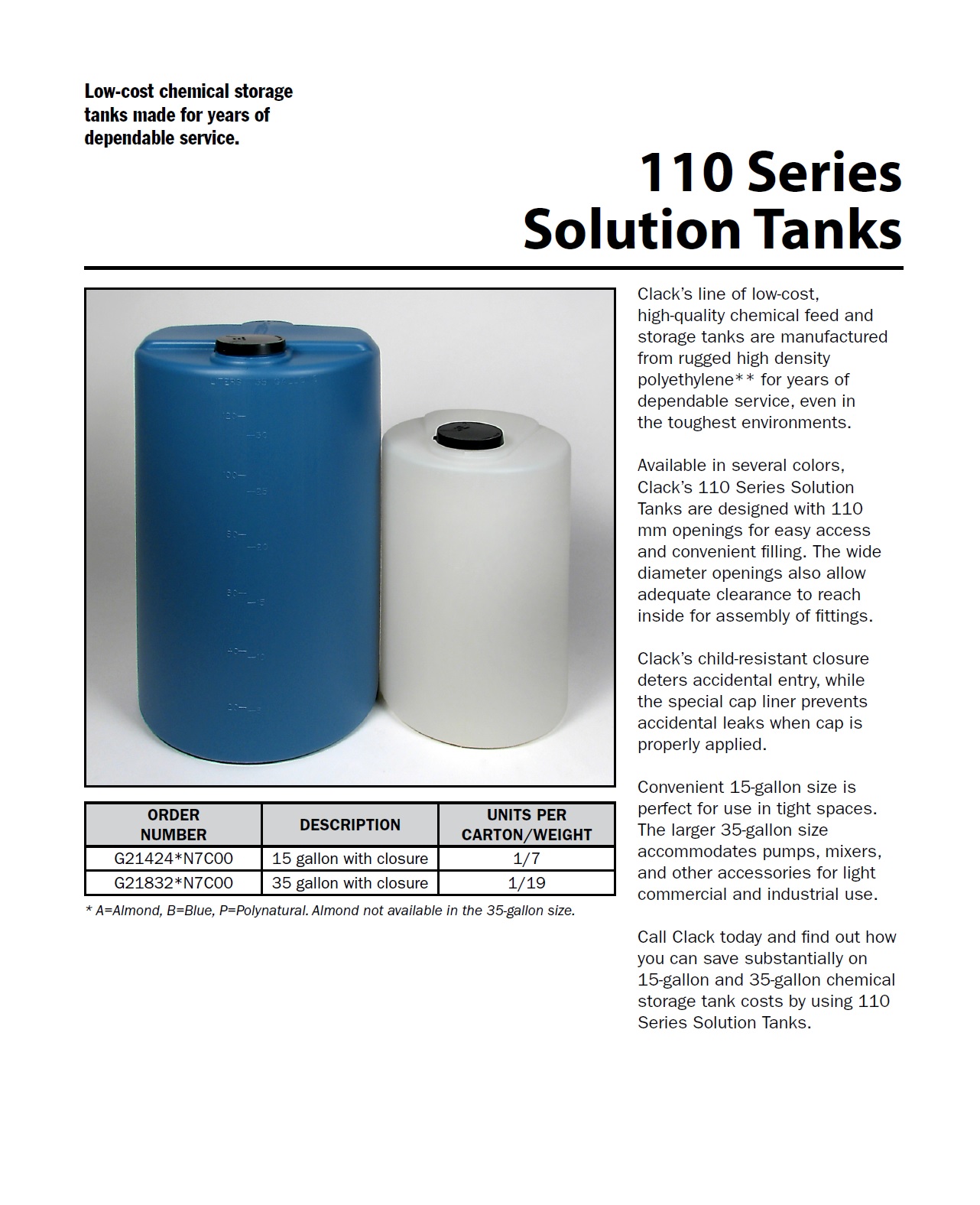 Clack’s line of low-cost, chigh-quality chemical feed and storage tanks are manufactured from rugged high-density polyethylene** for years of dependable service, even in the toughest environments.